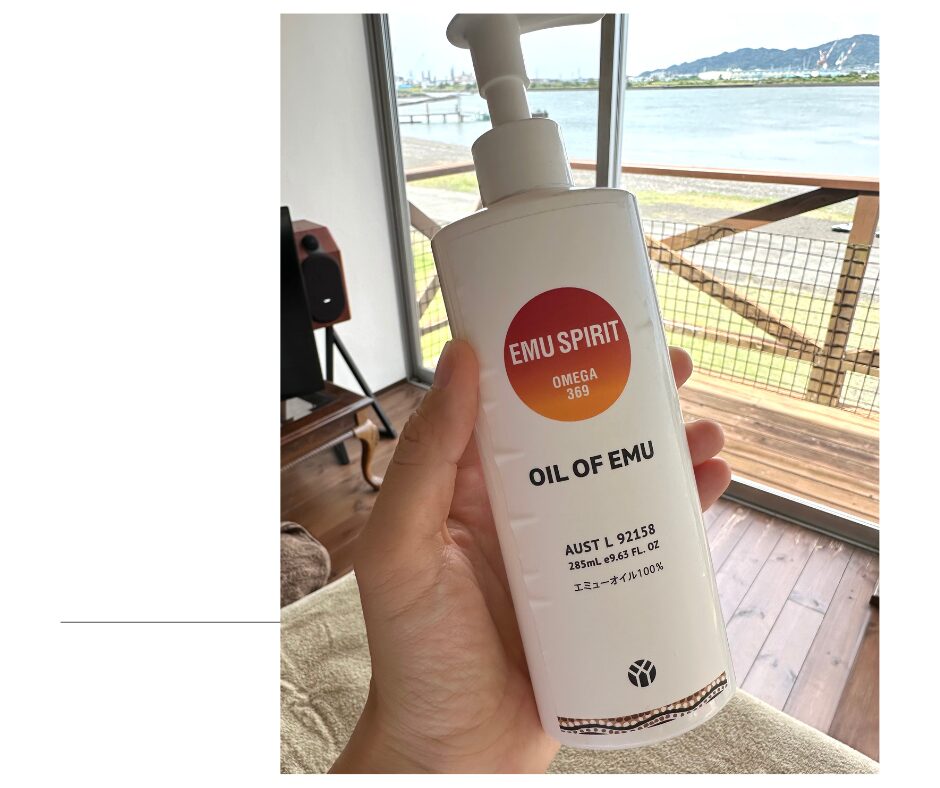 当サロンで使用するオイルのオプションとして「エミューオイル」をご用意しています。(+2,000円)エミューオイルはヒトの皮脂成分に極めて近い、天然由来成分のオイルです。必須脂肪酸「天然オメガ3・6・9」が理想的な成分バランスかつ豊富に含まれているため、体に優しく、かつ安全にケアします。また、オイル自体に抗炎症作用を持つのが特徴で、スポーツ現場では必須のオイルです。当サロンではエミュースピリット社のオーストラリア原産100%の厳選された製品のみを使用しております。